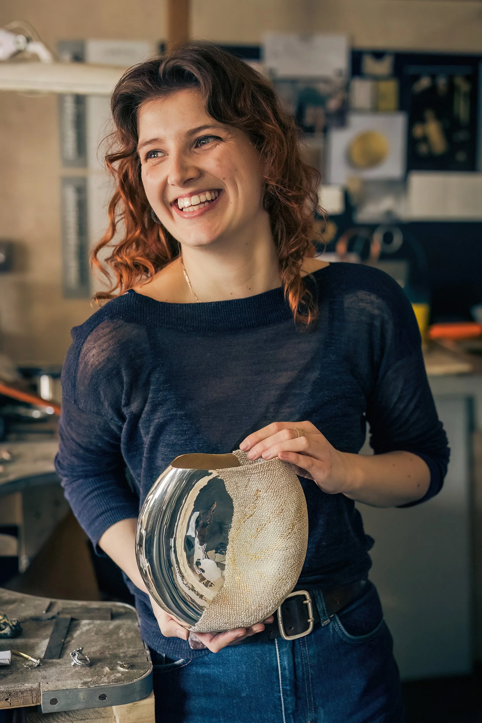 “Covid lockdown was also good timing for me,” as it allowed her to focus on designing and developing different techniques, working out what inspired her, and moving towards a gradual homecoming to weaving. She launched her first collection through The Goldsmiths’ Centre’s showcase for emerging talent, Shine, which was digital-only in 2020, and went on to study silversmithing at Bishopsland Educational Trust, where she mastered techniques like chasing (reverse hammering to create a raised design in metal); raising (hammering over a curved surface to create a bowl or vessel shape); and engraving. As she became more familiar with the material, Brown became interested in creating more sculptural work, that was “full of light and movement” and was awarded a grant by the Worshipful Company of Weavers to create a sculpture, “which was wonderful — sometimes you have ideas that never come to fruition, but this allowed me to work on a larger scale.” The result was The Veiled Sculpture; an undulating silver vessel raised with the help of silversmith Oscar Saurin, which acts as a plinth to display her biggest piece of woven metal yet, a fine mesh created with strands of silver fused with 24ct gold. “I was inspired by Classical veiled marble sculptures,” she says, “I love the way the marble can look like a translucent fabric and I wanted to see my weaving draped like that, as well. It was handmade and time-consuming, and I love that.” The vessel was the centrepiece for the 400th anniversary exhibition of the Worshipful Company of Gold and Silver Wyre Drawers, and has inspired her to make a wall hanging in the future.
