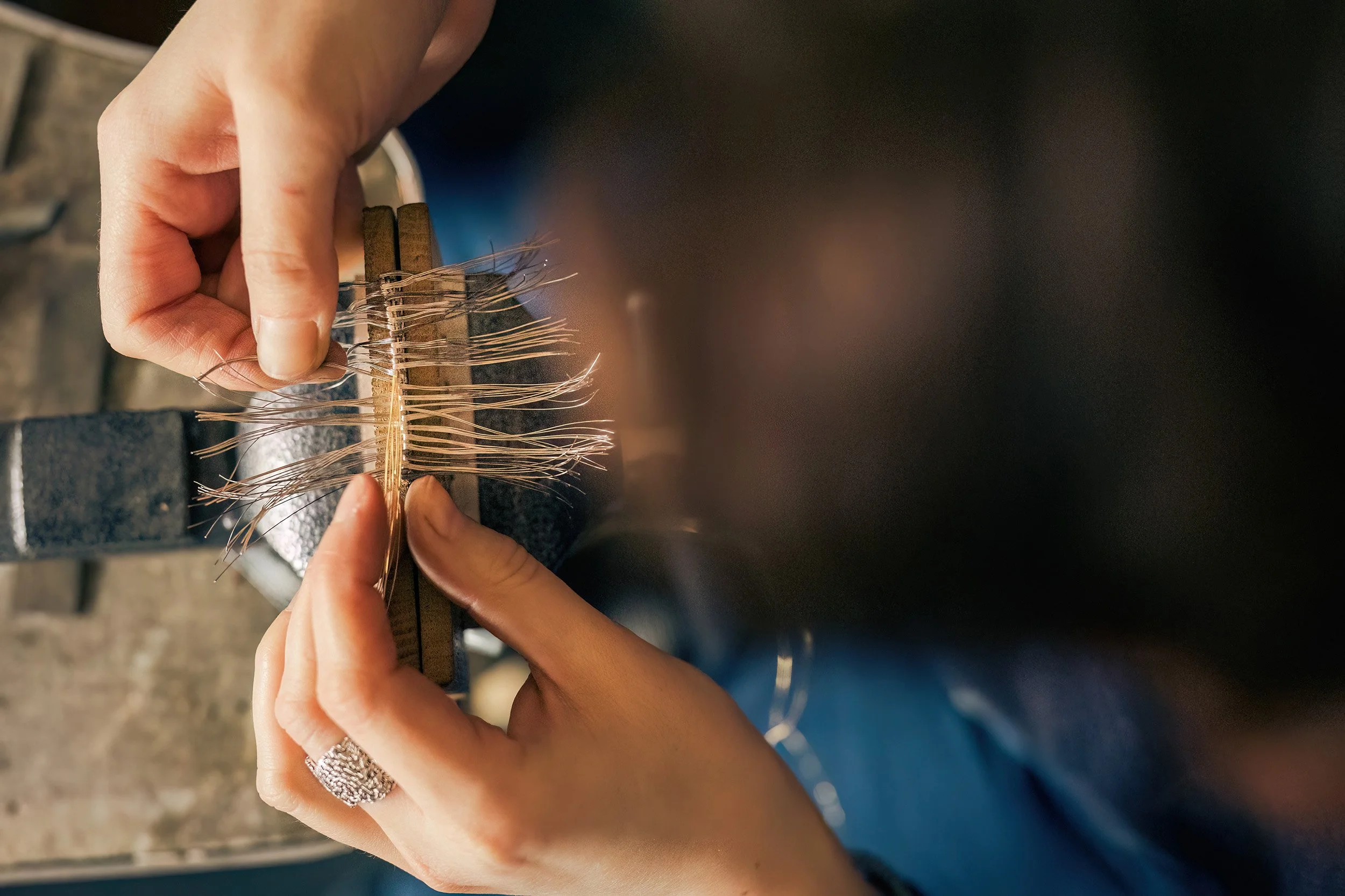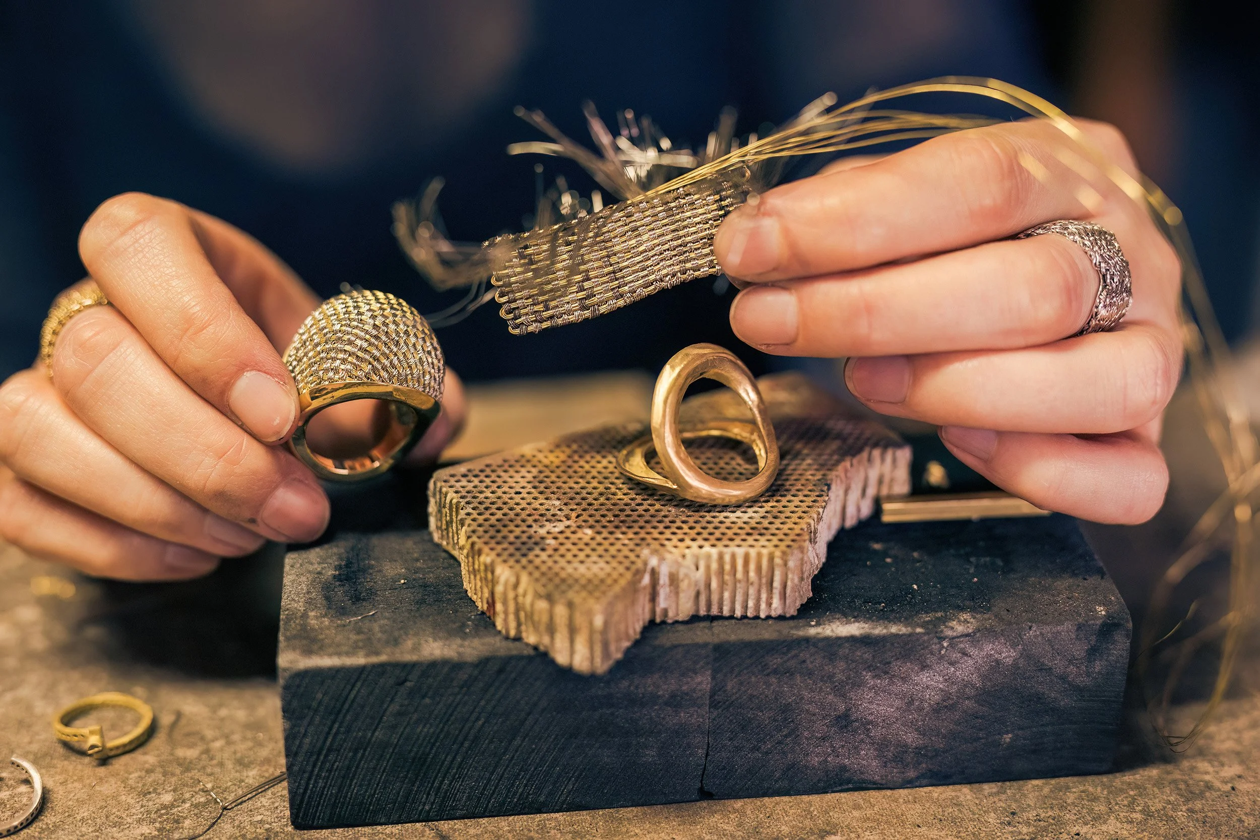 Today, her work marries simplicity of form with the complex texture of hand-woven metal, and Brown now weaves using the ancient Persian technique of Hasir Bafi. Traditionally used to make reed matting, she found the method enabled her to weave with gold and silver wire on a much tinier scale, creating a precious fabric that could be draped and moulded at will. “The most important thing for me, is to recreate the life of woven textiles in the metal. It’s about the feeling of fabric in my work, not just stiff metal weaving, but really replicating the sensation of silk. I can sculpt with the wire weavings I make, it holds its form really well.” She increases or reduces threads to create different forms, then cuts the woven material and fuses the ends together before shaping it. “I’m currently refining the edging,” she says, “It’s important to consider it in the design.” In one ring, the band is left open, with a stone set at either end to finish the piece, while in the Golden Silk bracelet, a two-tone gold and silver piece of weaving that slips like liquid over the skin, chain is woven directly onto a silver clasp.