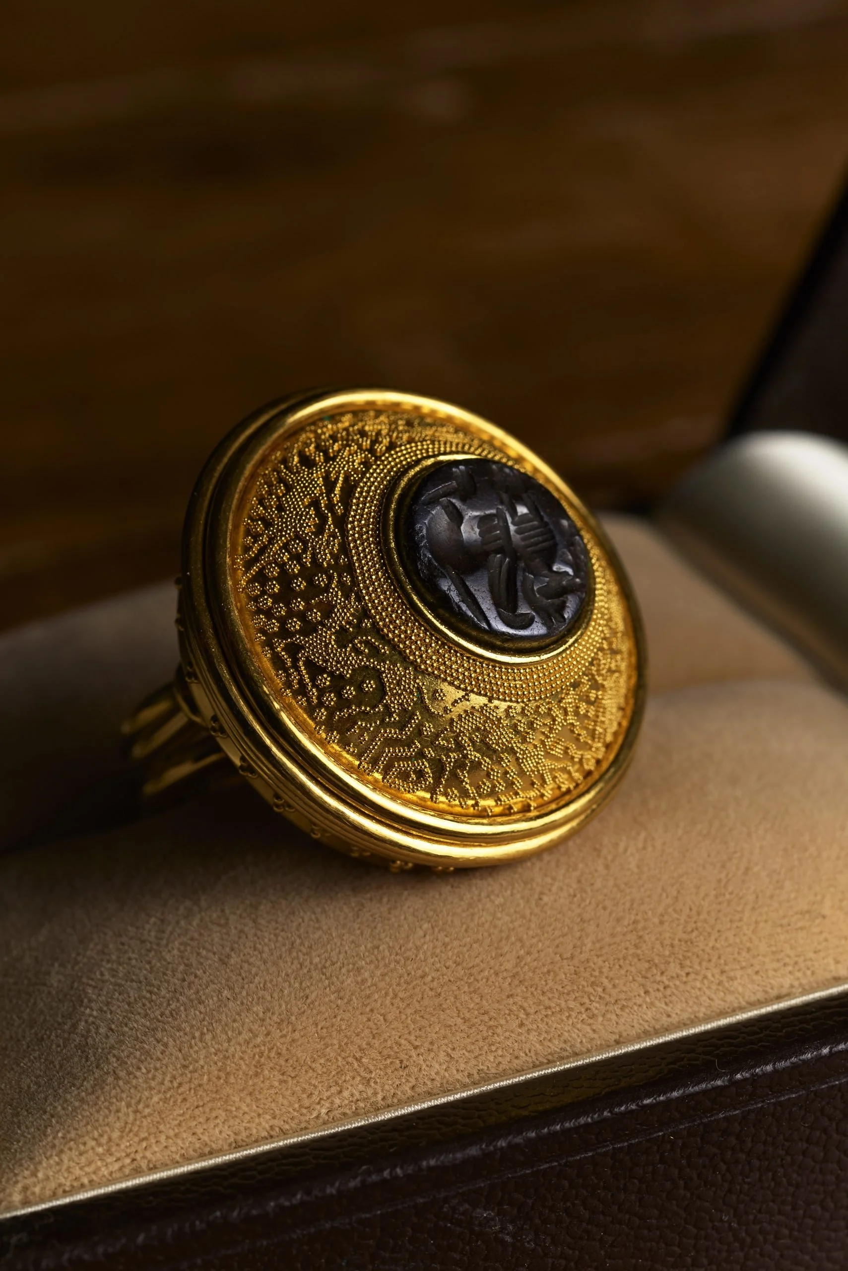 I found out it was most likely hammered from a sheet of gold which was probably not refined but alluvial gold. It was raised very much the way a silversmith raises a tea or coffee pot into somewhat of a melon shape and had these patterns of gold granules, rectangular labyrinth configurations and interlocking loops. It was an extraordinary creation, effortless in fact with an ethereal lightness of spirit. Just as the Roman philosopher Pliny said as if little girls with little fingers were laughing between themselves before lunch and applying the granules. It had insouciance.