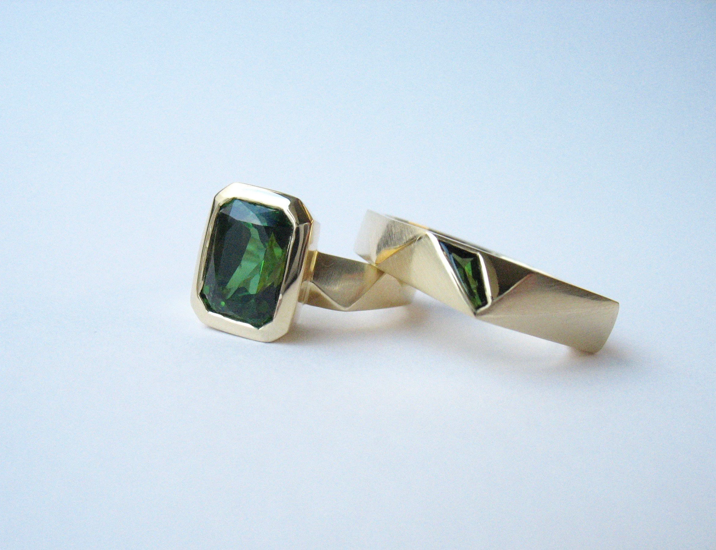 The importance of style is also central to today’s discerning purchaser of jewellery. Jeweller Melanie Eddy has found that “people are becoming more and more interested in expressing individual taste and style in their wedding rings.” Couples often ask for rings which aren’t matching, but which share a stylistic relationship. “My signature faceted bands can be designed so rings share a template in the side profile; meaning that they might appear different in terms of the facet arrangement, metal choice or proportions, but the geometry starts from the same place with both rings.” The wedding ring set pictured was designed for a couple: sharing 18 carat gold and green tourmaline, they are still strikingly different. Nor is a band necessarily the go-to choice. “We are seeing women explore single stone larger rings as wedding rings now. I’m seeing much more colour being incorporated in terms of the kinds of gemstones used – blues and greens and peaches and yellows.” And as for men, there is a similar sense of freedom in materials. “I have made wedding bands for men in rose gold, in palladium, in raw white gold, in silver.”