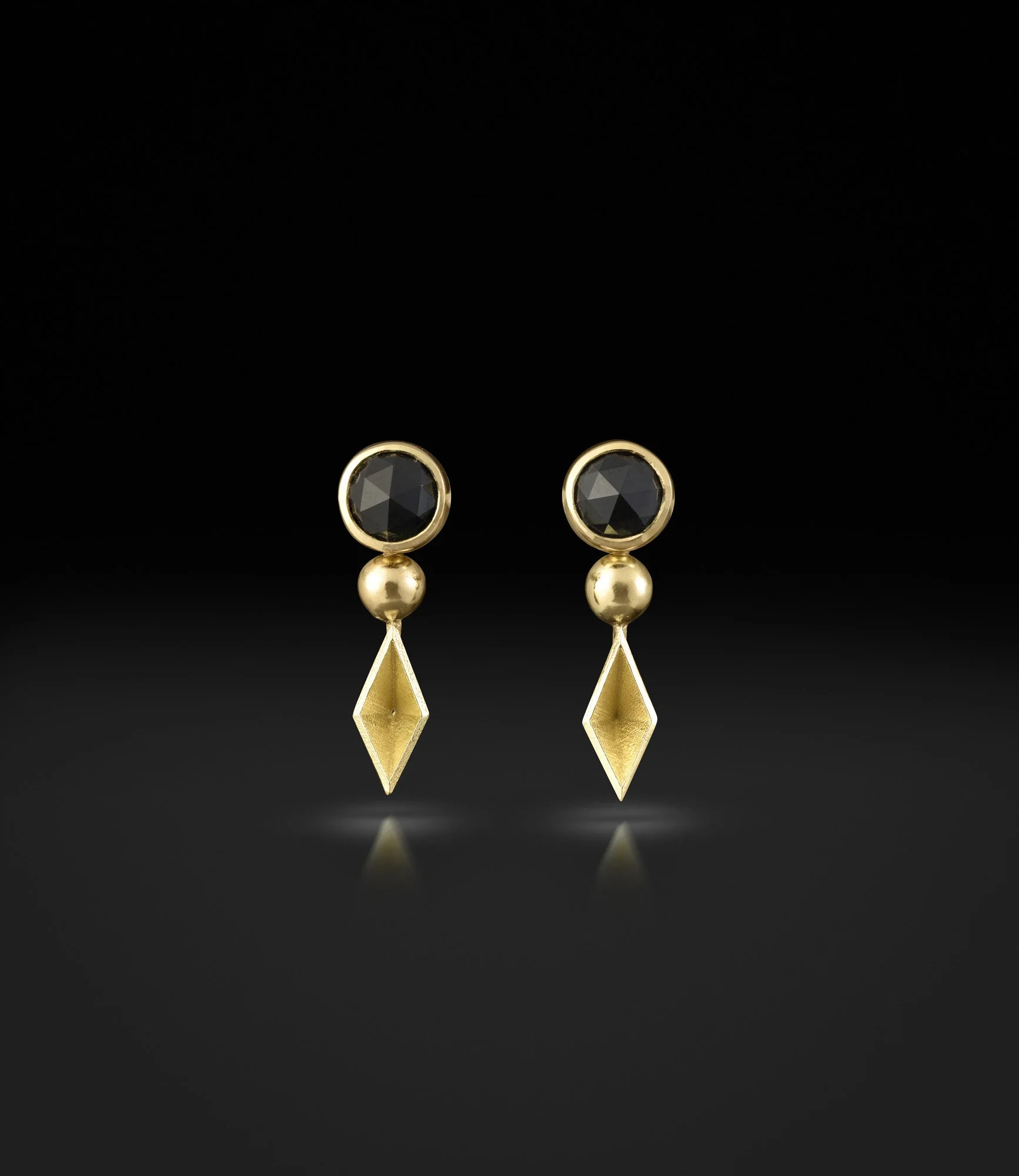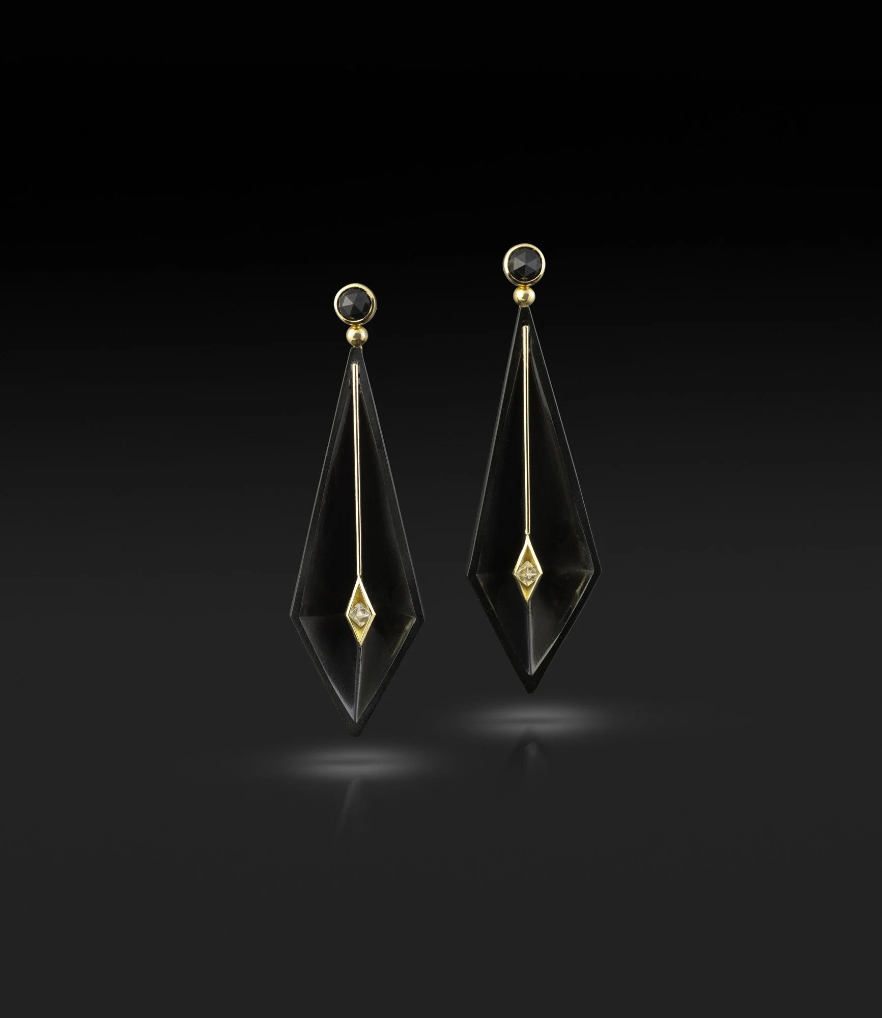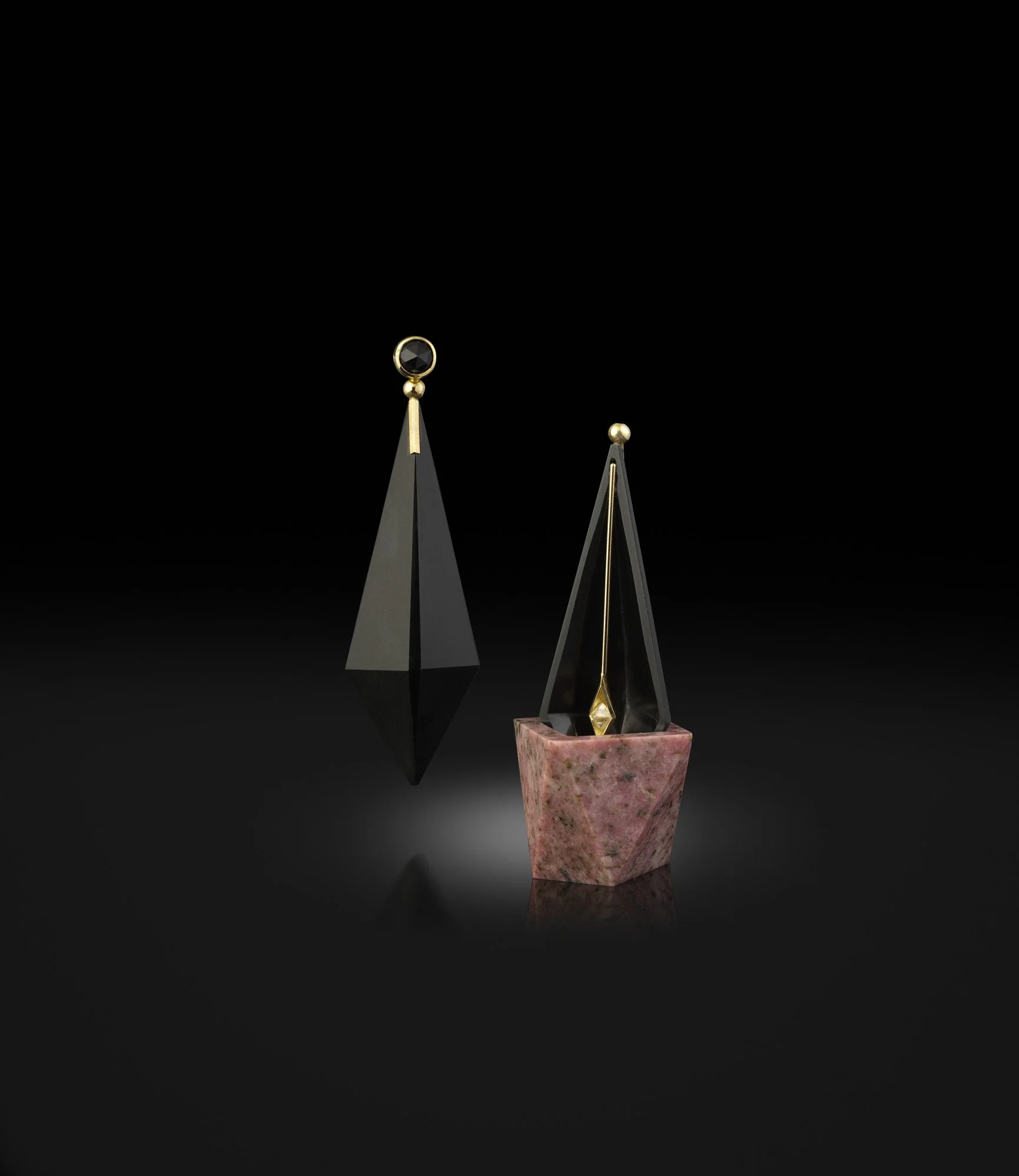 In Umbra, a natural octahedral diamond, collected from the ocean bed, became the inspiration for a pair of black jade earrings set in a hand-carved, faceted stand. The shape of the diamond is echoed and enlarged in the facets of the earring. They are designed to be transformable - the upper part of the earring, made of jade faceted to resemble a rose -cut diamond, can be unscrewed and connected to the diamond pendant to make a shorter pair of earrings.